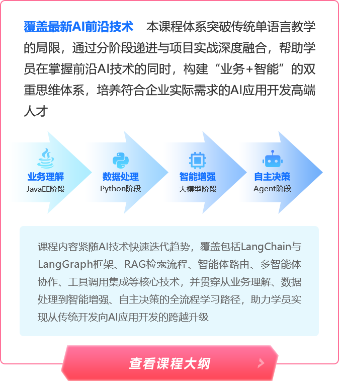 Java入门、Intellij IDEA、AI编程思维、基础语法、面向对象编程、抽象类、分层开发原则、常用API、IO流、函数式编程、Lambda、方法引用、Hutool、Http协议、大模型应用、大模型调用。